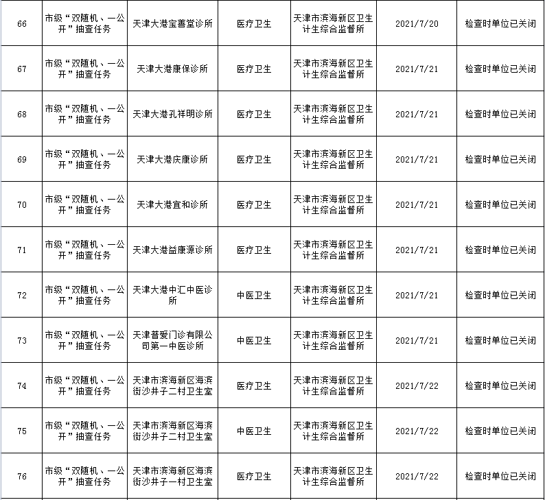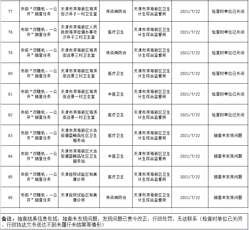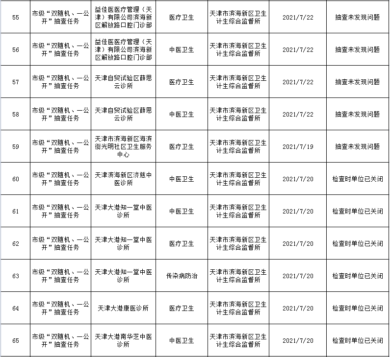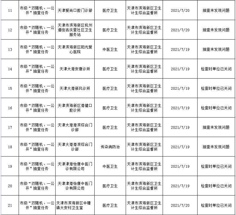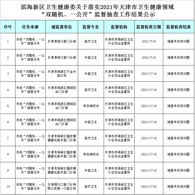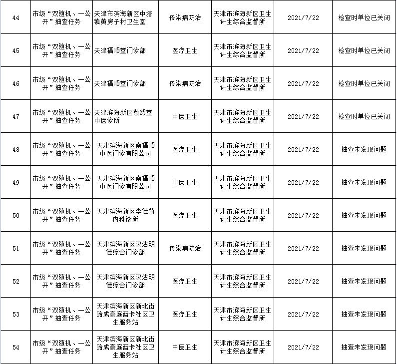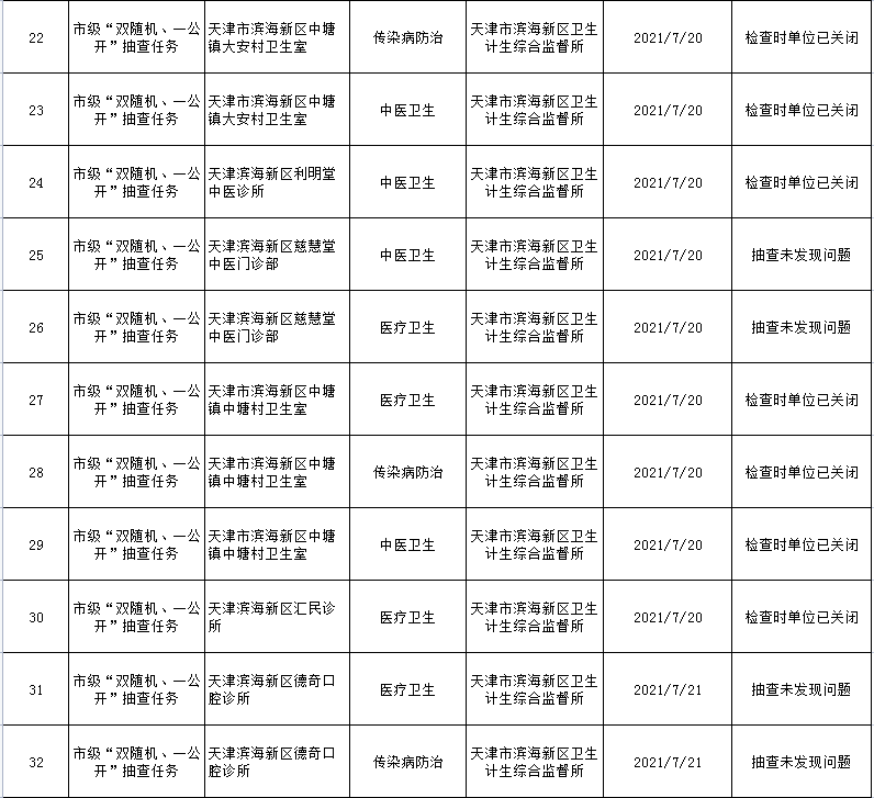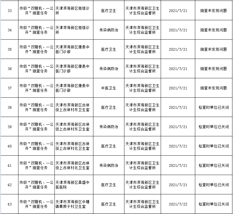 滨海新区卫生健康委关于落实2021年天津市卫生健康领域“双随机、一公开”监督抽查工作结果公示