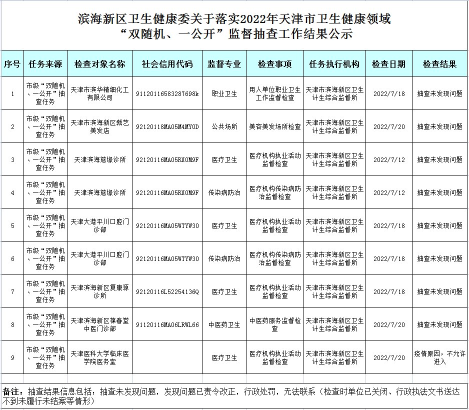 滨海新区卫生健康委关于落实2022年天津市卫生健康领域“双随机、一公开”监督抽查工作结果公示